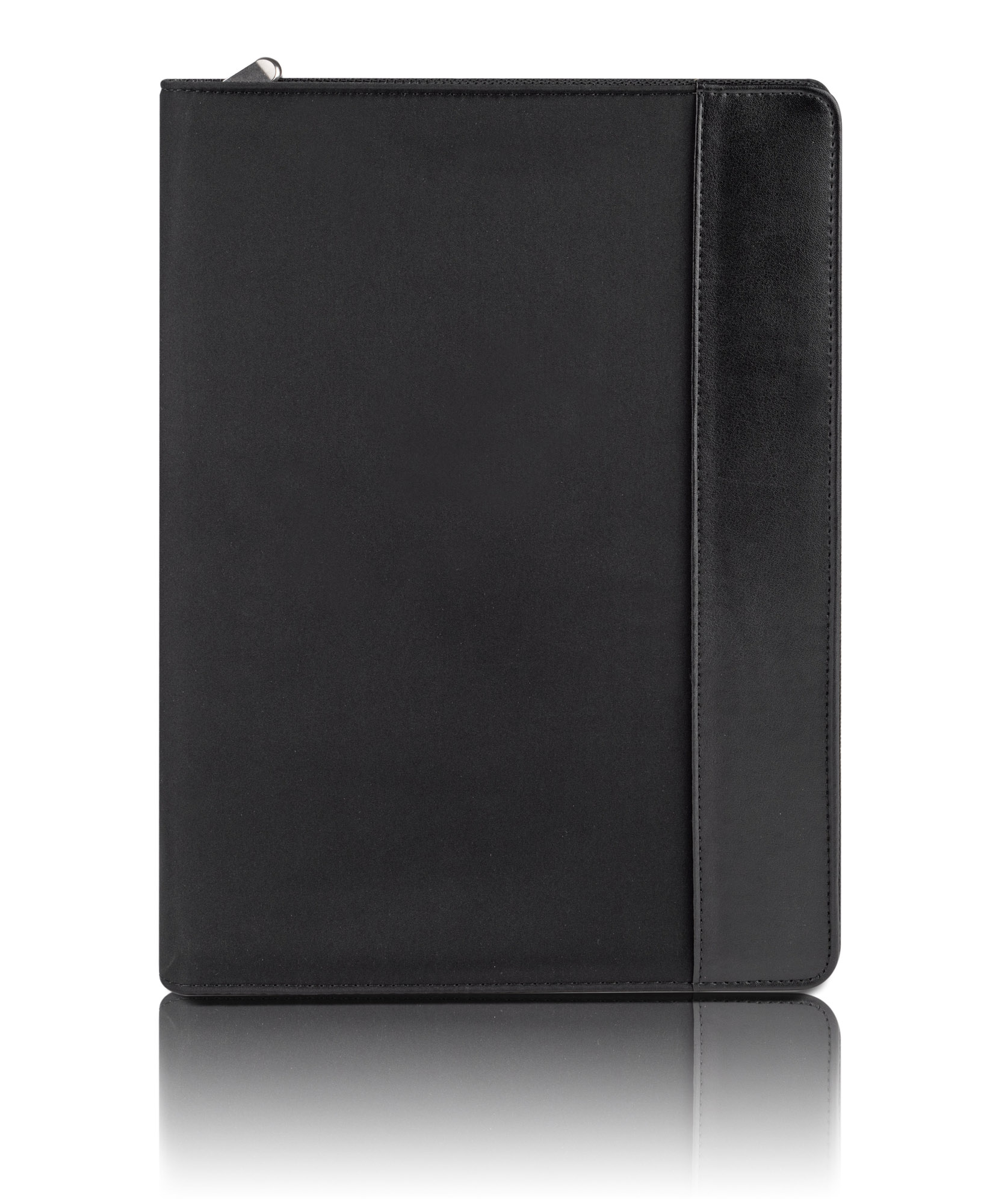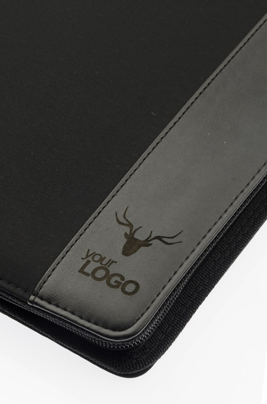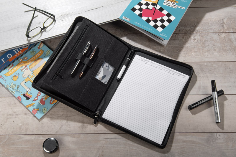 Teczka zapinana na zamek, wykonana z mikrofibry i poliestru 600D. Zawiera dużą kieszeń, kieszeń zapinaną na zamek, 2 miejsca do wpięcia USB, małe kieszonki, miejsce na długopis, notes. Notes nie jest umocowany na stałe, ale wsuwany w kieszonkę, dzięki czemu można go łatwo wymienić. Logo wygrawerujemy na teczce.