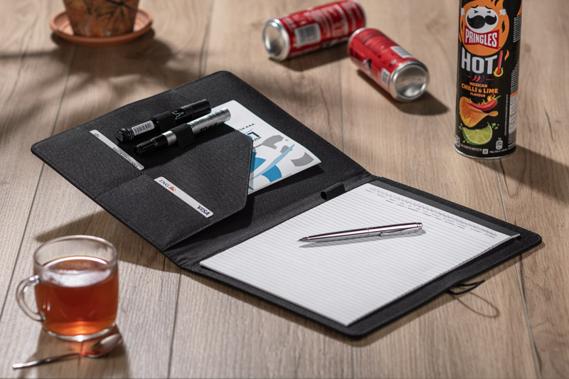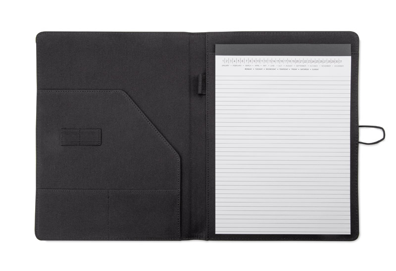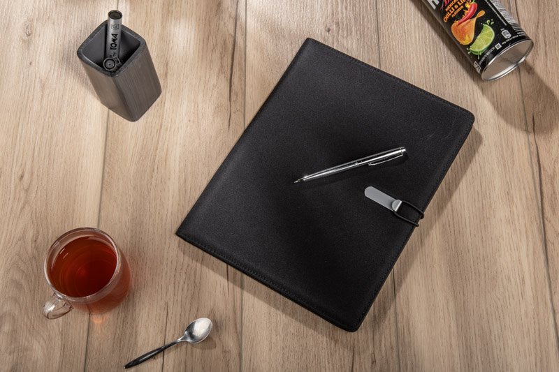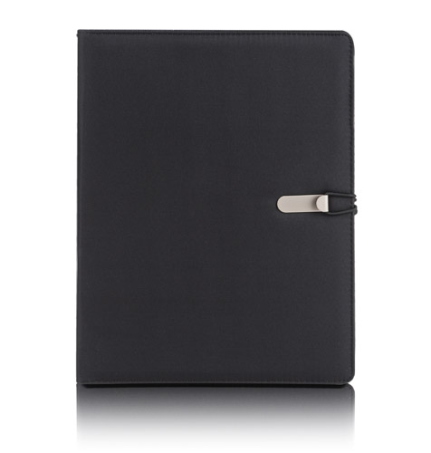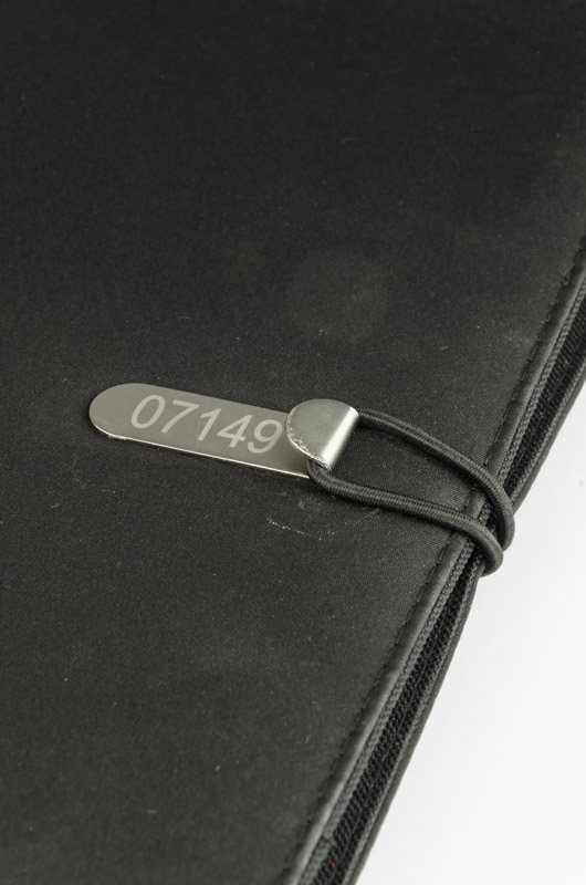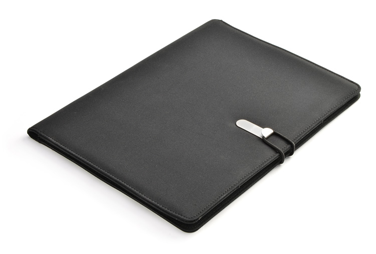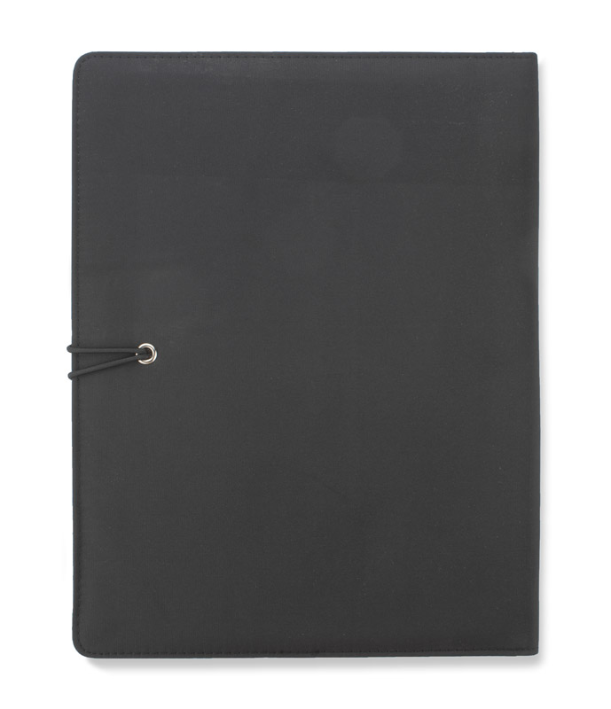 Prosta teczka o nowoczesnym wyglądzie. Zawiera dużą kieszeń, małe kieszonki, 2 miejsca na USB, miejsce na długopis, notes. Teczka zapinana na gumkę zaczepianą o metalowy haczyk.Wykonana z mikrofibry i poliestru. Notes nie jest umocowany na stałe, ale wsuwany w kieszonkę, dzięki czemu można go łatwo wymienić. Logo wygrawerujemy na metalowym haczyku.