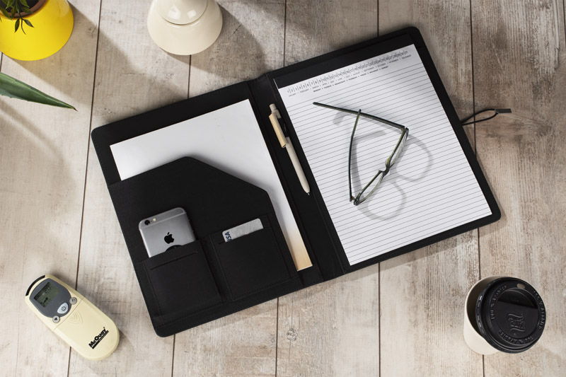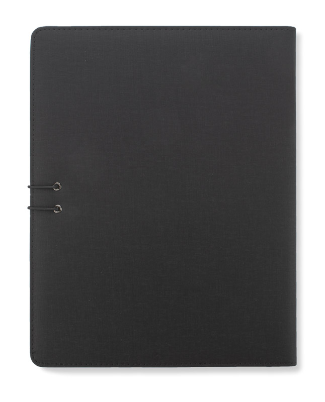Teczka konferencyjna TELLA zamykana na gumkę zakończonąmateriałem skóropodobnym (PU) w kolorze szarym, która ułatwia otwieranie teczki i jednocześnie stanowi ciekawą i elegancka ozdobę . Zawiera jedną kieszeń do przechowywania dokumentów, dwie mniejsze kieszonki, miejsce na długopis i wizytówki oraz notes o formacie A4 z możliwością jego wymiany.