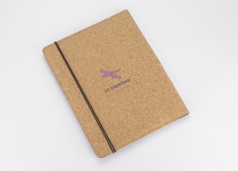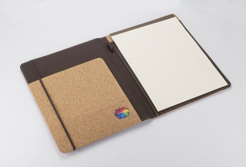 Korkowa teczka A4 z notatnikiem. Zawiera dużą kieszeń do przechowywania dokumentów, dwie mniejsze kieszonki oraz miejsce na długopis. Zamykana za pomocą gumki z metalowym elementem. Zapakowana w woreczek non woven.