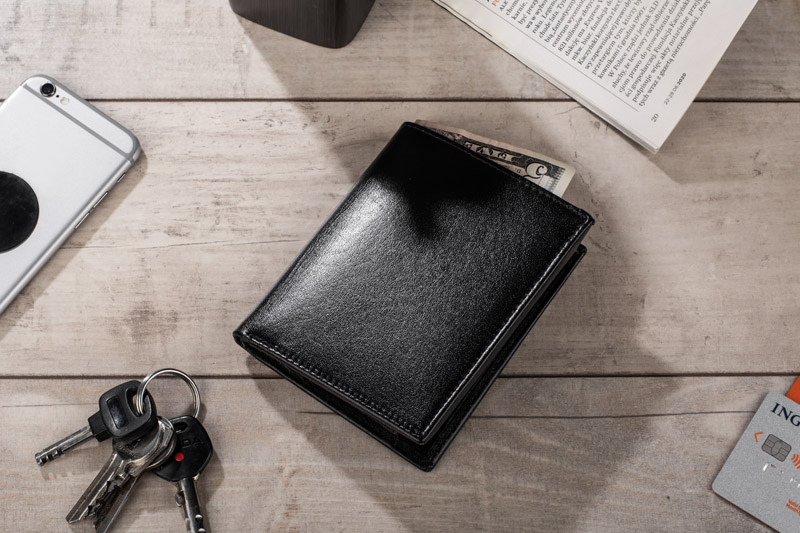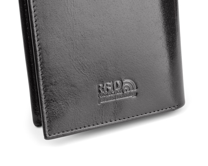 Portfel wyposażony w miejsce na bilon, 2 kieszenie na banknoty, 4 miejsca na karty kredytowe, 5 kieszeni na dokumenty, kieszeń zapinaną na suwak. Portfel pakowany w drewaniane pudełko. Dodatkowo portfel wyposażony jest w folię zabezpieczającą przed kredzieżą danych z kart kredytowych, blokując sygnał RFID. Logo wykonamy metodą tłoczenia lub grawerowania.
