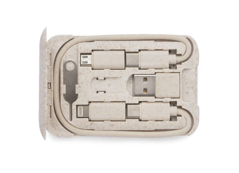 OLIN to praktyczny zestaw potrzebnych do ładowania kabli, który zmieści się w każdej torebce, plecaku, czy w kieszeni. Podstawowy kabel USB C - USB C wraz z adapterami: USB C - USB, USB C - microUSB, USB C - iPhone został zapakowany w poręczne i kompaktowe etui, które pełni jednocześnie funkcję stojaka do telefonu. Dodatkowo w etui znajduje się kluczyk do karty SIM oraz miejsce na przechowywanie karty SIM. Etui zostało wykonane z tworzywa zmieszanego w 40% ze słomą pszenną, dzięki czemu do wyprodukowania go zużyto mniej nowego tworzywa sztucznego.