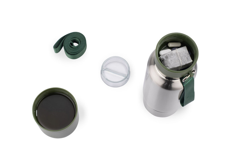 Butelka termiczna RON to doskonały wybór dla aktywnych osób, które cenią sobie zarówno wygodę, jak i funkcjonalność. Będzie idealna na trening i spontaniczne wyprawy. Butelka jest wyposażona w karabińczyk oraz dwie smycze: krótką i długą na zmianę, umożliwiające wygodne przenoszenie i łatwe dostosowanie do różnych sytuacji. Wystarczy założyć ją na nadgarstek podczas biegu lub zawiesić na plecach podczas wędrówki. Dodatkowo RON posiada zamknięcie z praktycznym schowkiem na drobiazgi (np. tabletki czy suplementy diety). Unikalna podstawa z tworzywa, która po wykręceniu staje się dodatkowym kubkiem, eliminuje ryzyko poparzenia języka i pozwala na wygodniejsze spożywanie napoju.