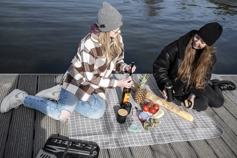 Zestaw do grilla ROLAN w poliestrowym etui zawiera 16 elementów ze stalowymi rączkamii: 4 szpikulce do szaszłyków, szczypce, łopatkę z otwieraczem do butelek, widelec, 8 uchwytów do kolb kukurydzy oraz silikonowy pędzelek.
