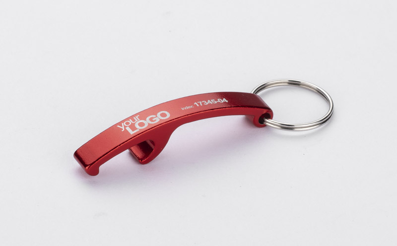 Aluminiowy brelok do kluczy z funkcją otwieracza, dostępny w pięciu kolorach. Pakowany w woreczek foliowy.
