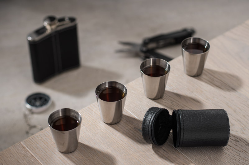 Cztery kieliszki stalowe o pojemności 30 ml pakowane w etui z materiału skóropodobnego (PU) PU zapinanego na zamek. Logo grawerujemy na powierzchni kieliszków.
