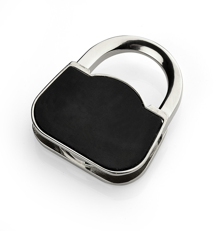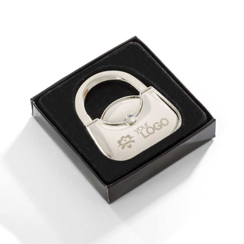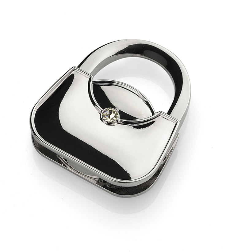 Składany wieszak na torebkę w kształcie damskiej torebki wykonany z metalu. Wieszak ozdobiony szkiełkiem zapewniającym mu elegancki wygląd. Pakowany w czarne pudełeczko. Na powierzchni wieszaka wykonujemy znakowanie grawerem.