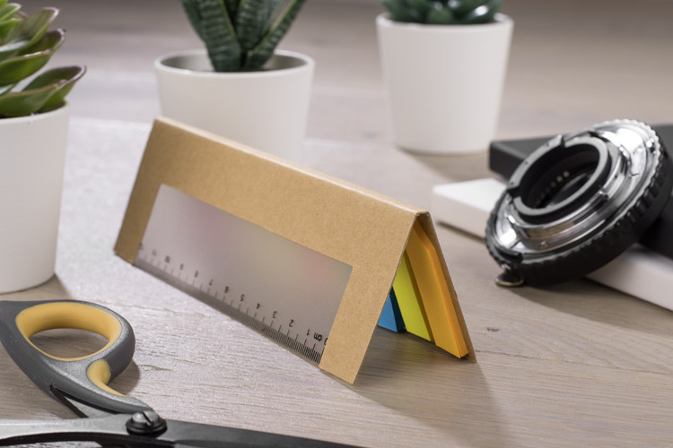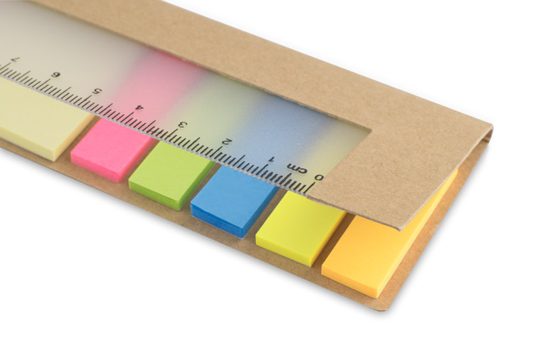 Podręczny zestaw składający się z kolorowych karteczek samoprzylepnych i linijki. Niezbędny na każdym biurku.