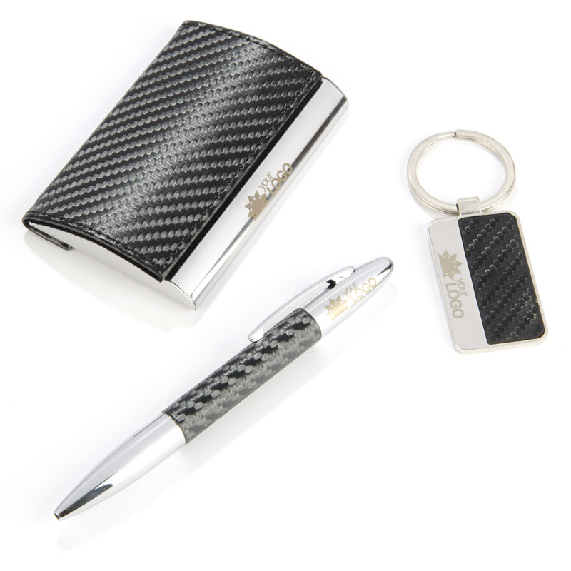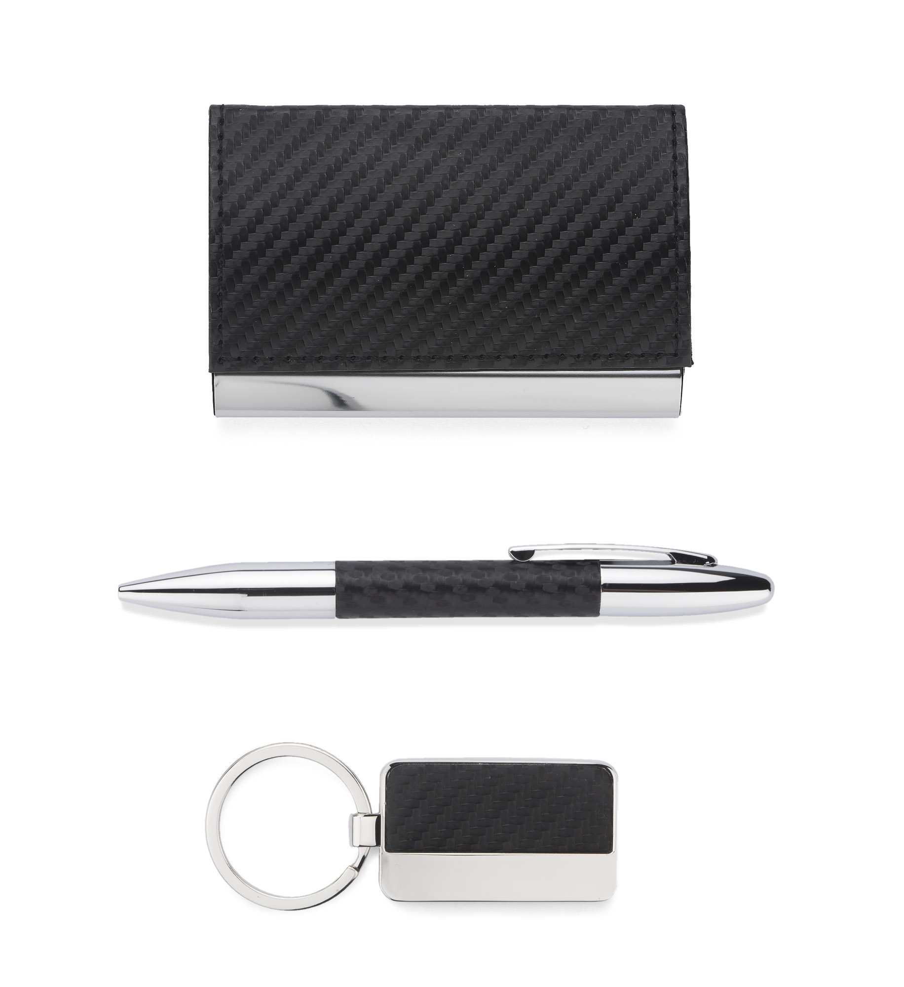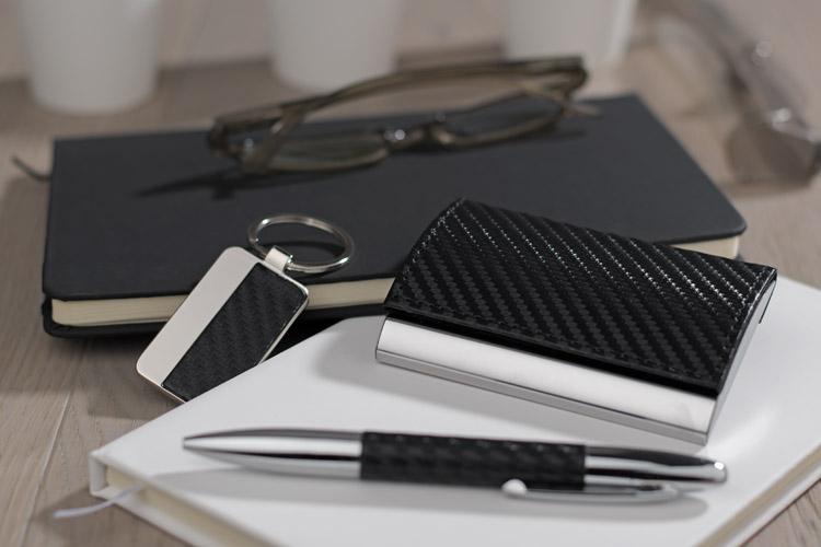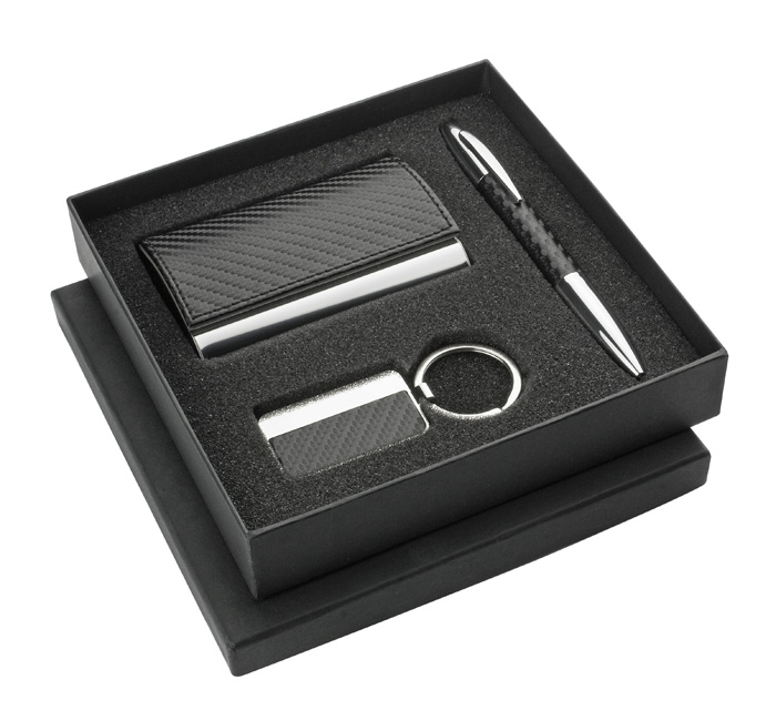 Elegancki zestaw upominkowy w skład którego wchodzą wizytownik, brelok oraz długopis. Całość zapakowana w czarne puełko. Logo wygrawerujemy na breloku albo nadrukujemy na wizytowniku.