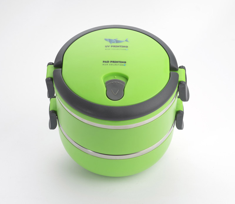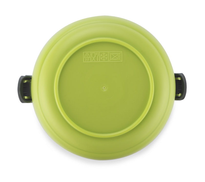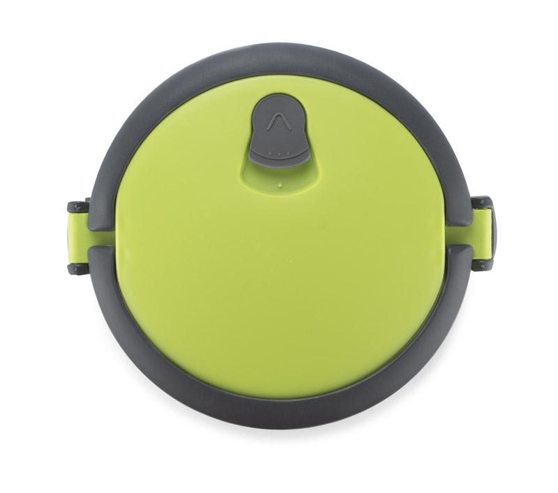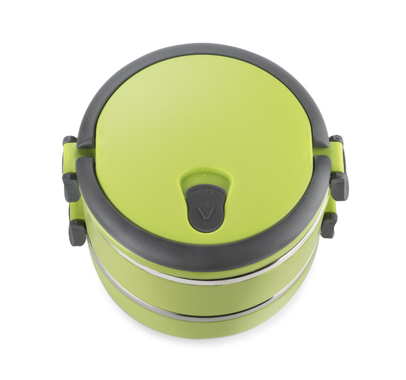 Pojemnik z wnętrzem ze stali nierdzewnej podzielony na dwie komory, które składamy jedną na drugą, co zapewnia poręczne i wygodne przenoszenie dwudaniowych posiłków. Górna komora wyposażona w uszczelkę. Uchwyty z tworzywa sztucznego z możliwością złożenia. Łączna pojemność: 1400 ml.