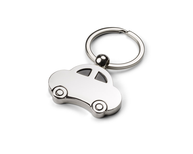 Brelok do kluczy z zawieszką w kształcie samochodu, wykonany z chromowanego metalu. Brelok dwustronny.