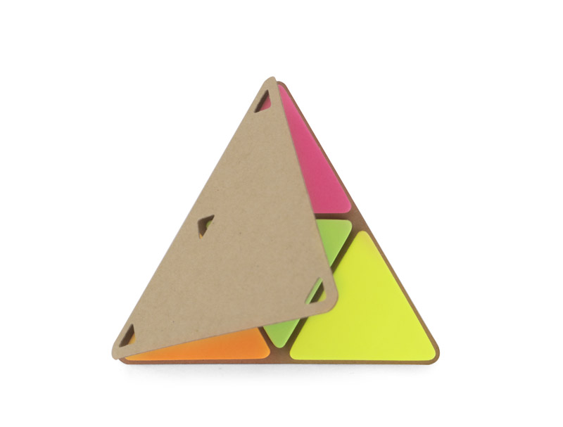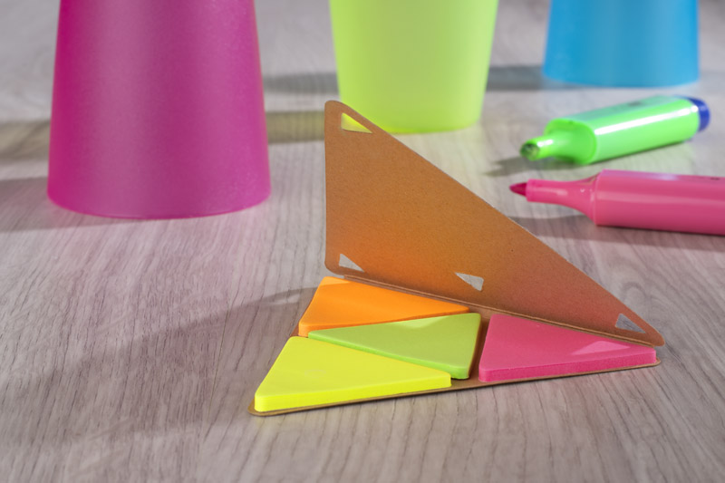 Karteczki samoprzylepne PEL w kształcie trójkąta z ekologiczną papierową okładką. Wewnątrz znajduje się 25 sztuk karteczek w 4 kolorach: pomarańczowym, różowym, zielonym, żółtym.