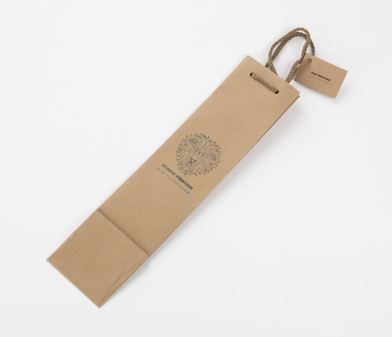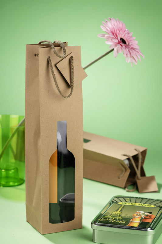 Torebka na wino z okienkiem w kształcie butelki znakomicie wyeksponuje zapakowany w nią produkt. Torebka wykonana jest z papieru.