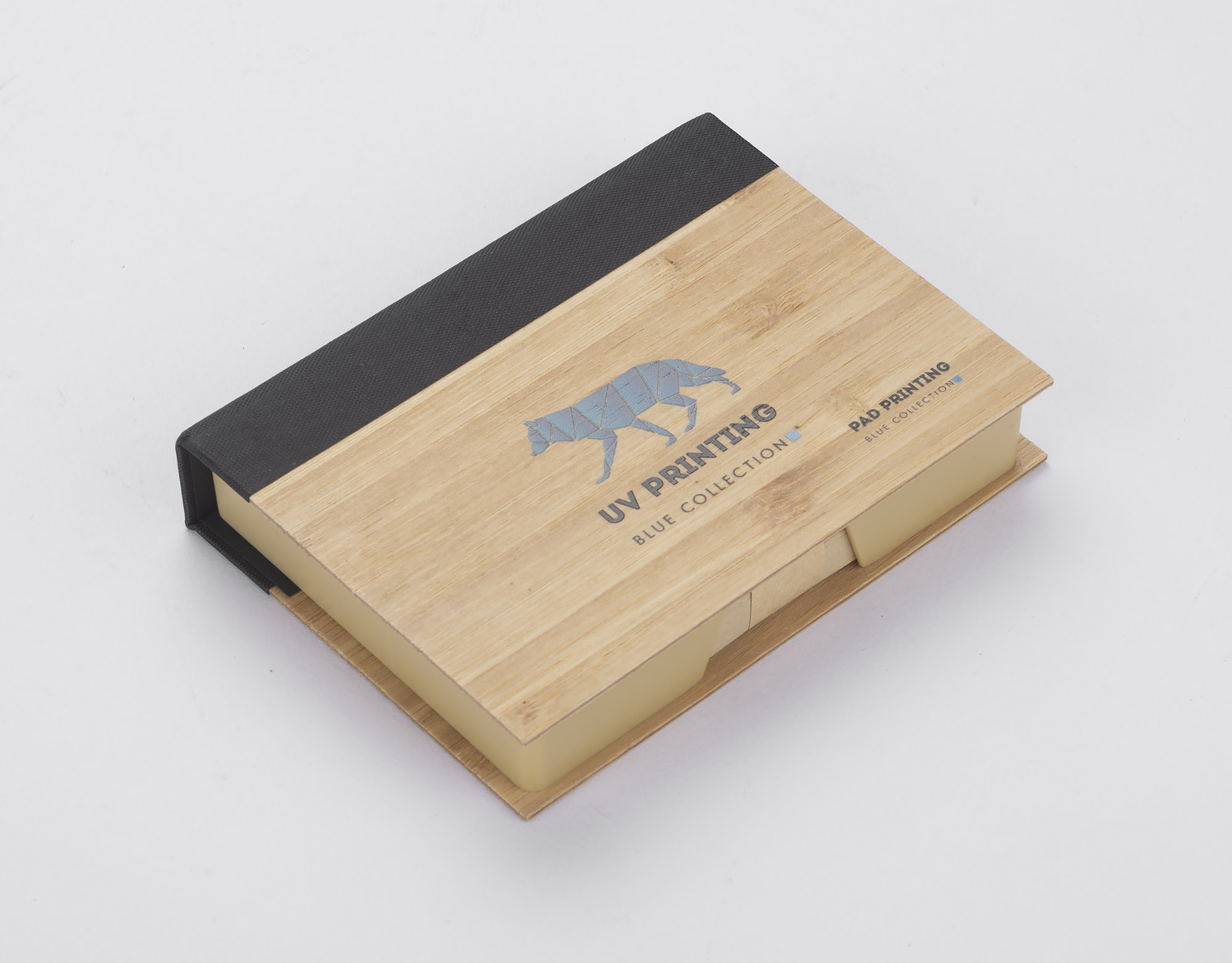 Zestaw karteczek na biurko zapakowany w etui wykonane z bambusa. W zestawie znajdują się brązowe karteczki do zapisków.