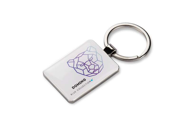 MOTI to prostokątny brelok wykonany z wysokiej jakości metalu, zaprojektowany z myślą o usłudze znakowania metodą doming. Dzięki tej technologii, możliwe jest precyzyjne naniesienie logo firmy w formie estetycznej naklejki żywicznej, która tworzy efekt zbliżony do trójwymiarowego obrazu.