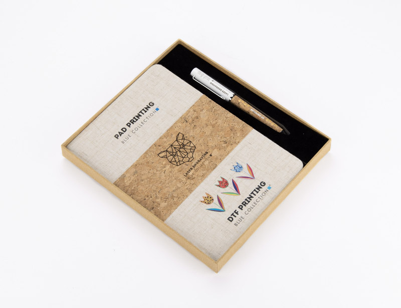 Zestaw CALMO w jasnych, klasycznych kolorach z pewnością przypadnie do gustu miłośnikom minimalizmu. Notes posiada 96 kartek w kratkę, format A5. Długopis z niebieskim wkładem. Zarówno notes jak i długopis wykończone są elementami z naturalnego korka. Całość zapakowana w papierowe pudełko w kolorze brązowym. Wymiary produktu: 147 x 210 x 15 mm (notes); 136 x ⌀ 11 mm (długopis); 195 x 220 x 25 mm (pudełko).