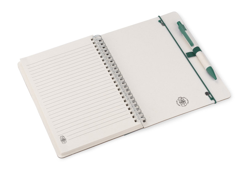Notes REGALI wraz z długopisem wykonane są z kartonów po mleku. Długopis posiada wkład w kolorze niebieskim. Do notesu dołączona jest linijka o długości 20 cm pasująca kolorem do wykończeń na długopisie. Gumka na długopis oraz ta zamykająca notes w kolorystyce wykończeń długopisu.