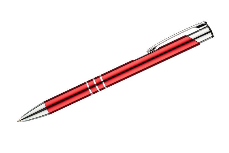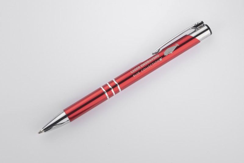 Metalowy długopis o metalizowanej chromowanej powierzchni. Długopis automatyczny z 3 ringami i niebieskim wkładem. Logo grawerujemy na powierzchni długopisu.