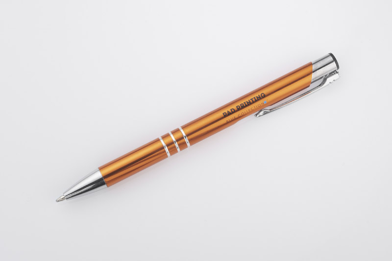 Metalowy długopis o metalizowanej chromowanej powierzchni. Długopis automatyczny z 3 ringami i niebieskim wkładem. Logo grawerujemy na powierzchni długopisu.