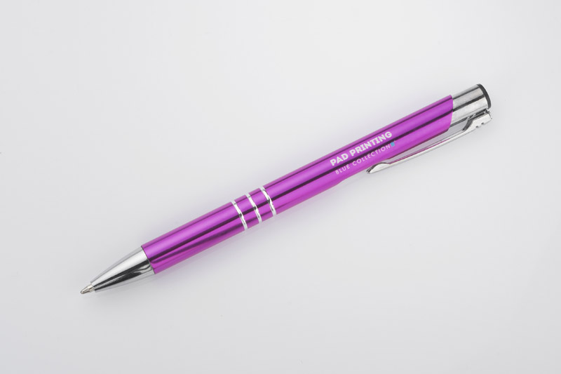Metalowy długopis KALIPSO o metalizowanej chromowanej powierzchni. Długopis automatyczny z 3 ringami i niebieskim wkładem. Logo grawerujemy na powierzchni długopisu.