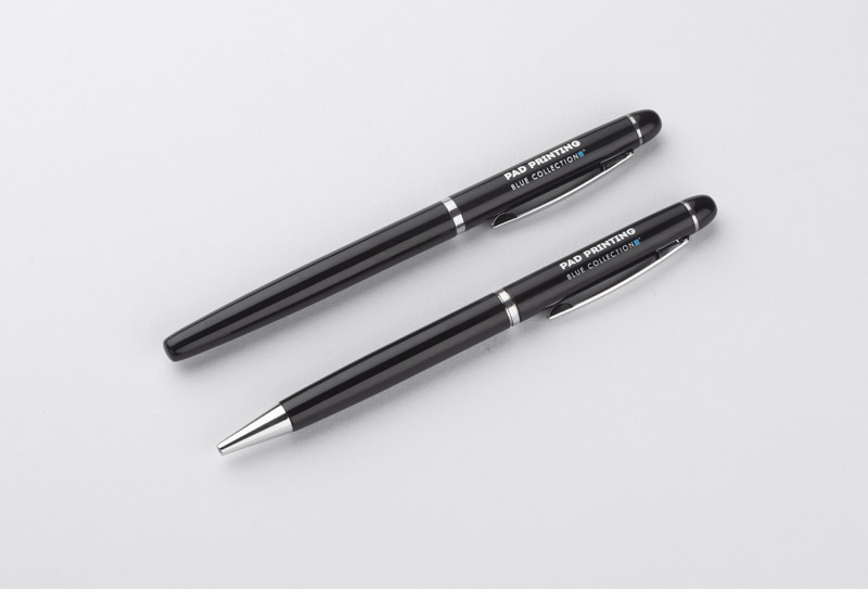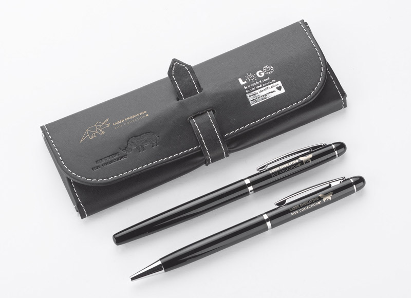 Elegancki zestaw piśmienniczy pakowany w etui z materiału skóropodobnego (PU). W zestawie znajdują się długopis oraz pióro kulkowe. Logo wygrawerujemy na powierzchni artykułów piśmienniczych. Możliwość wygrawerowania logo także na etui.