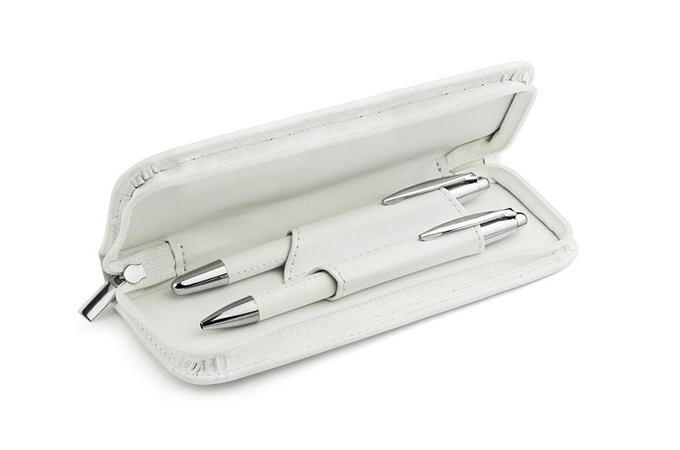 Komplet piśmienniczy: długopis i pióro kulkowe w etui z materiału skóropodobnego (PU). Długopis i pióro kulkowe z wkładami w kolorze niebieskim. Logo wygrawerujemy na artykułach piśmienniczych.