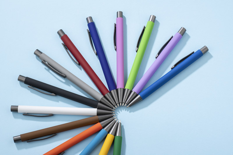 Długopis GOMA to prosty design połączony z przyjemną w dotyku gumowaną powierzchnią. Całość jest utrzymana w lekkich, matowych barwach. Wykonany z aluminium. Wykończenia w kolorze grafitowym. Wkład w kolorze czarnym.