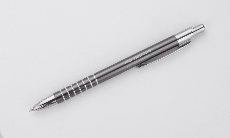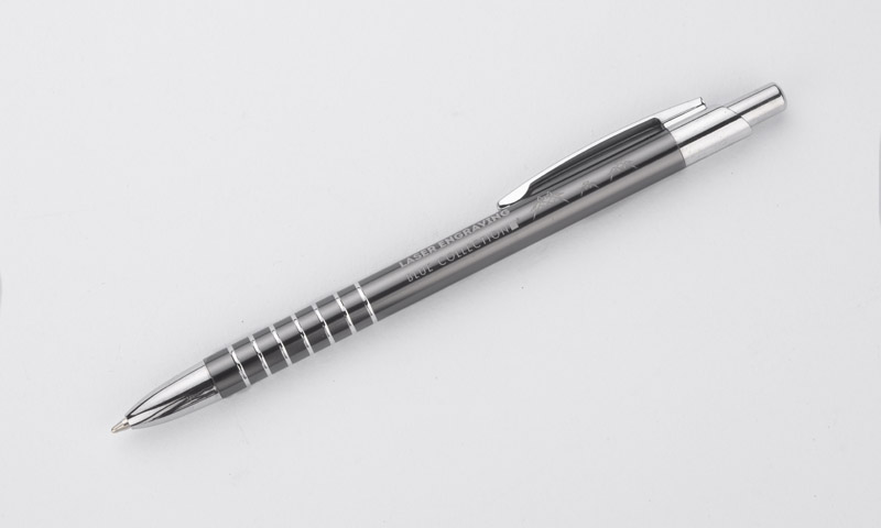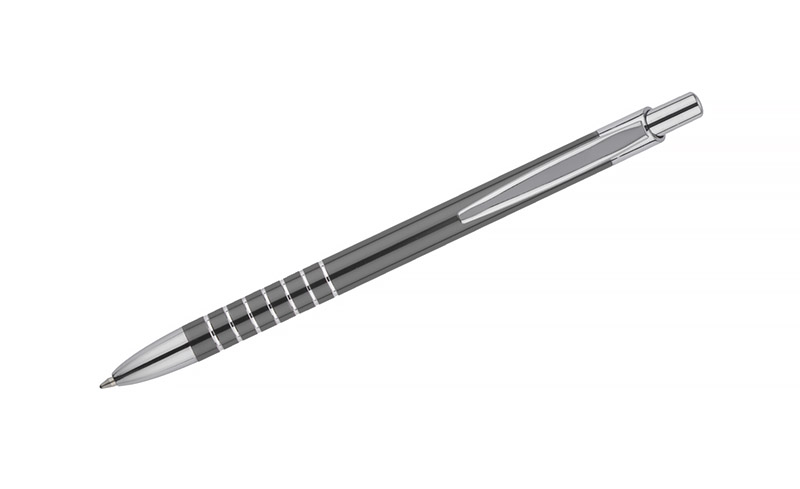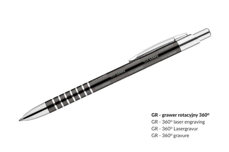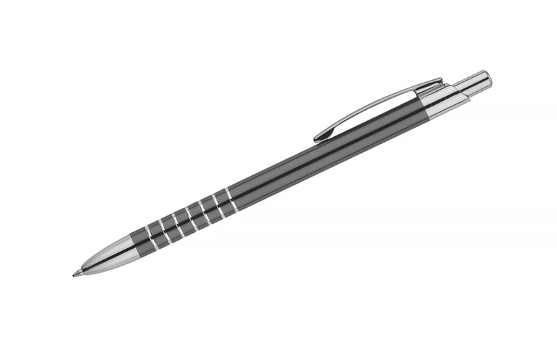 Prosty długopis wykonany z aluminium ozdobiony szerokimi ringami. Logo wygrawerujemy.