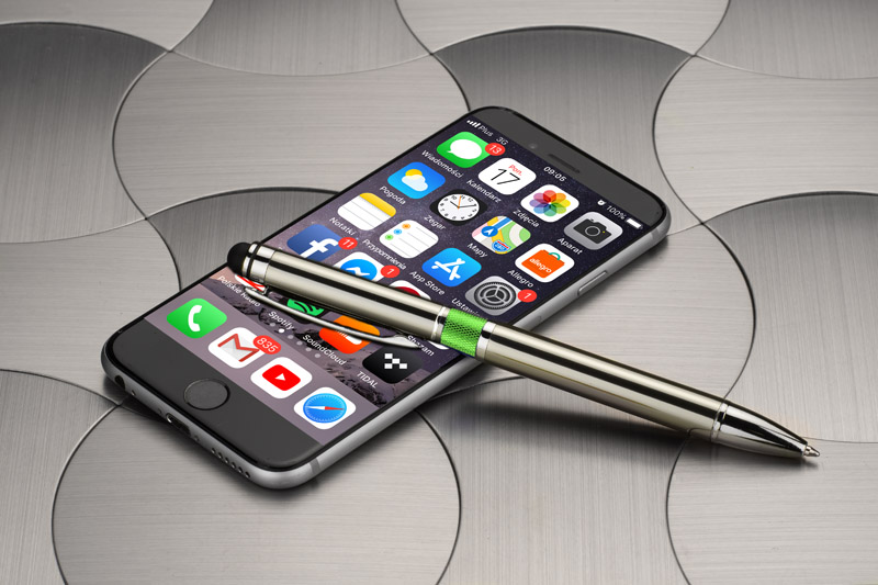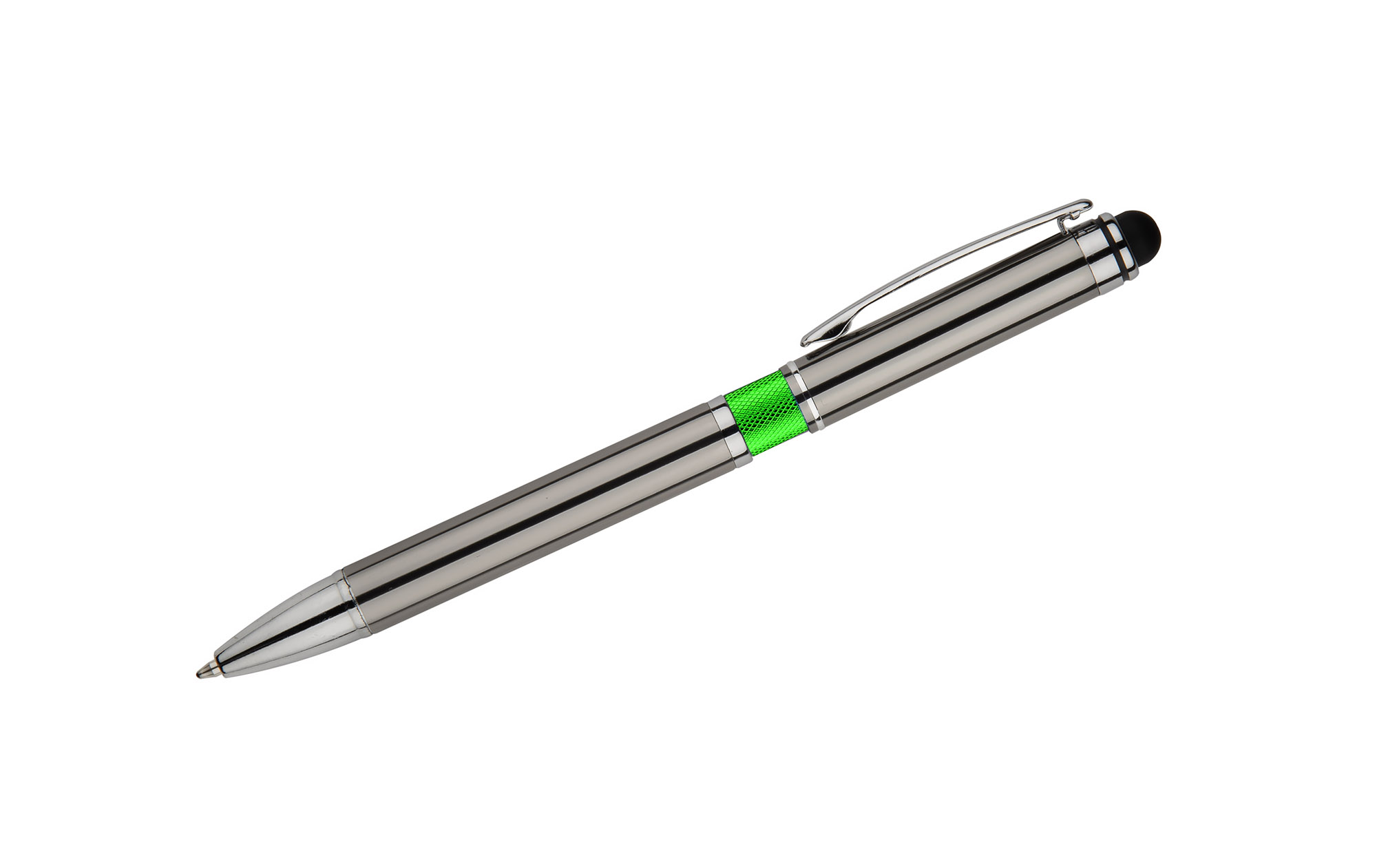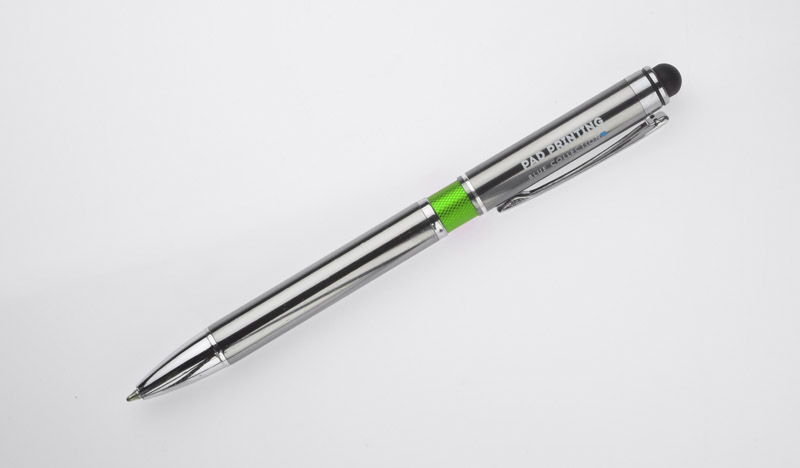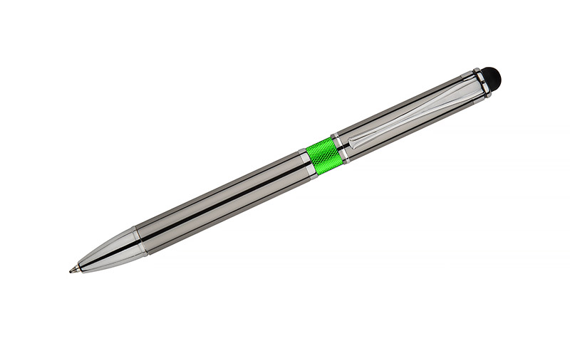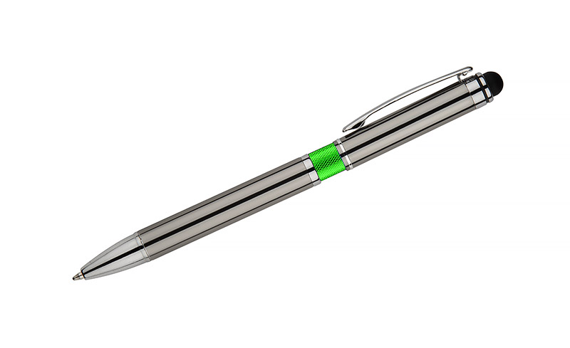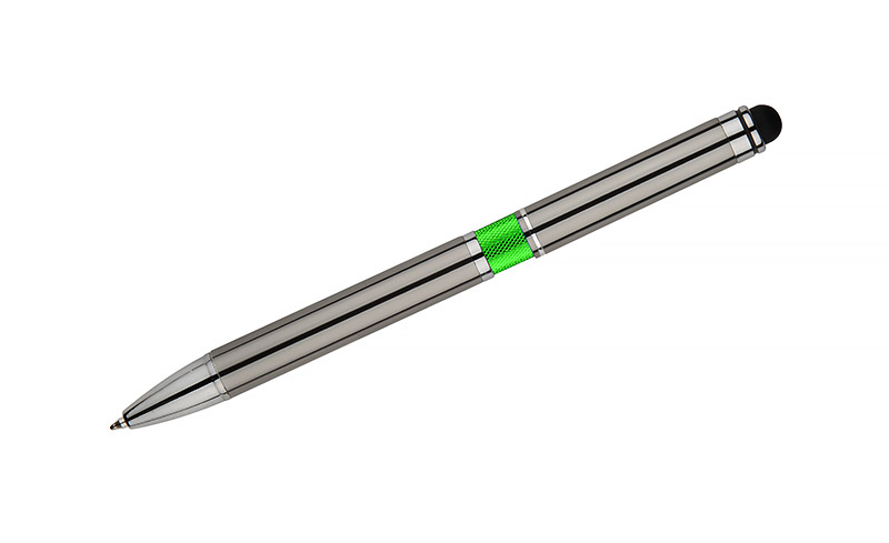 Elegancki metalowy długopis z kolorową aplikacją na korpusie oraz touchpenem.