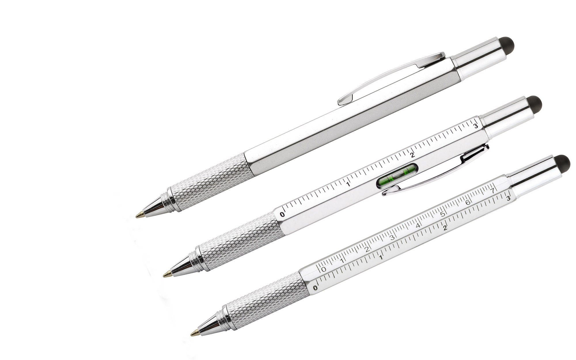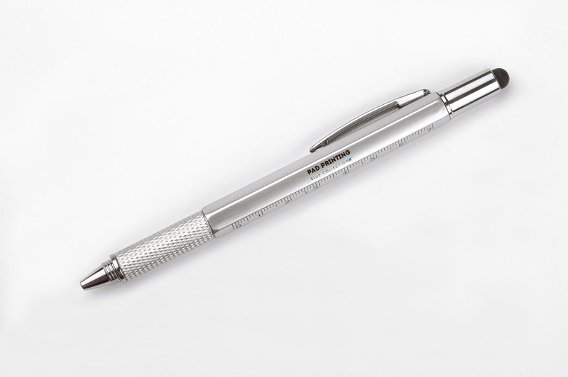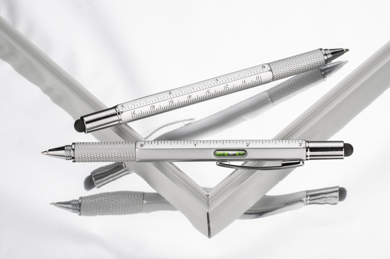 Wielozadaniowy długopis dla każdego fana majsterkowania. Gadżet wyposażony jest w dwie miarki (centymetry i cale) umieszczone na korpusie oraz małą poziomicę. Natomiast pod nakrętką z touch penem znajduje się dwustronny śrubokręt mocowany za pomocą magnesu - poręczny i wygodny w użyciu. Znakowanie możliwe na korpusie.