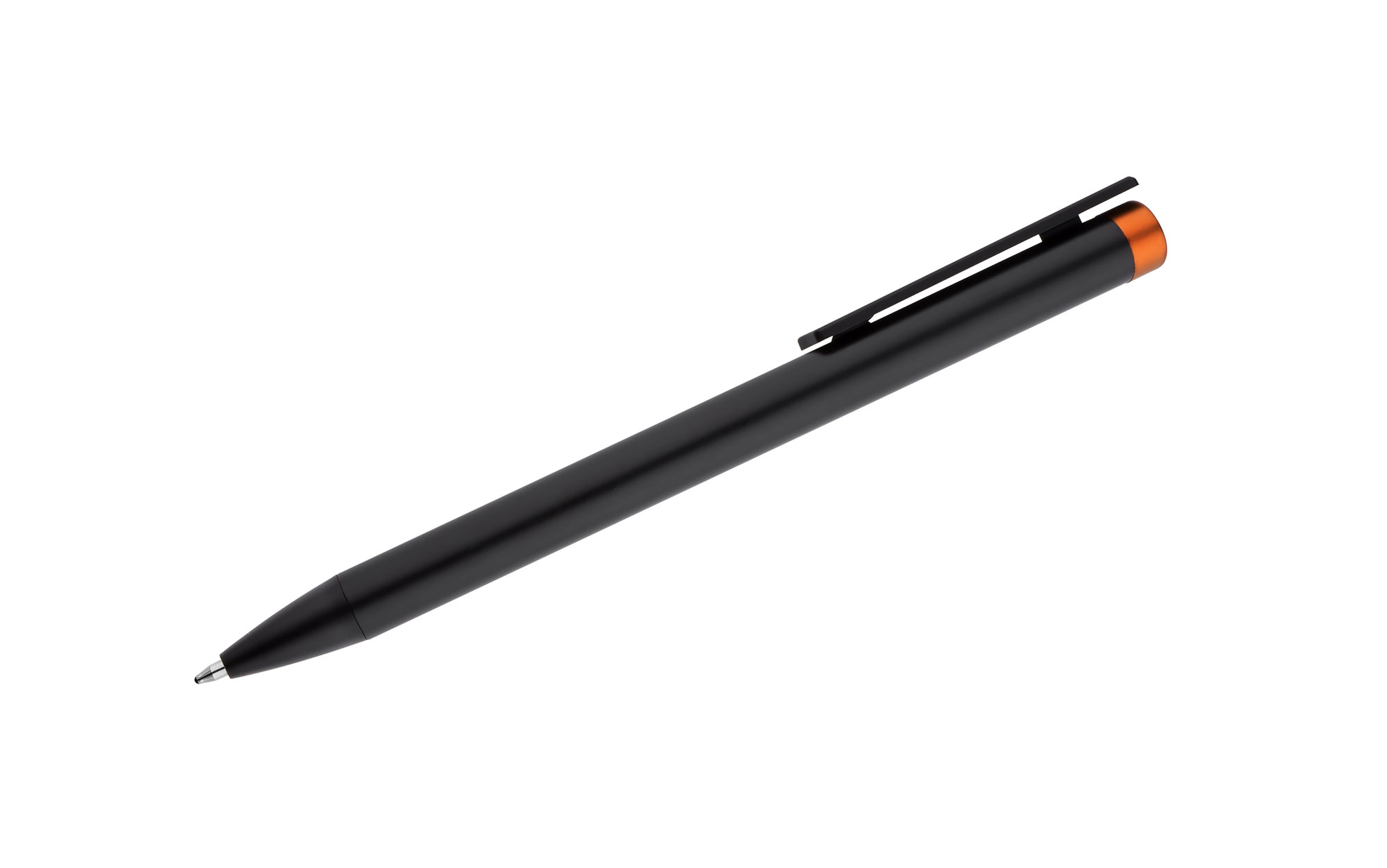 ALI to wyjątkowy długopis umożliwiający wykonanie znakowania w kolorze zbliżonym do końcówki długopisu oraz całkowicie zaskakującego grawerowania w dwóch kolorach - w kolorze zbliżonym do końcówki długopisu oraz białym (kolor aluminium). Czarny metalowy korpus oraz czarne wykończenia stanowią idealne tło dla kolorowego grawerowania. Długopis automatyczny. Wkład typu X20 o grubości 1.0 mm w kolorze niebieskim.