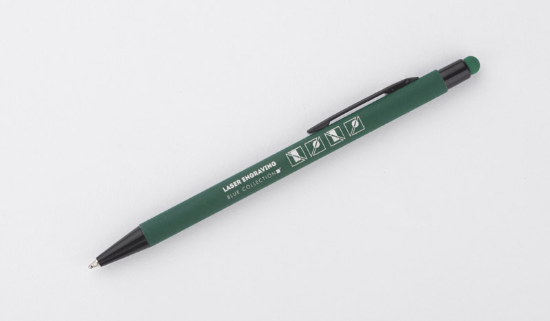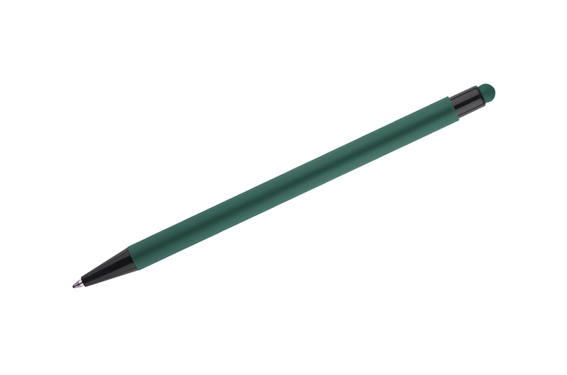 Klasyczny, cienki długopis PRIM wykonany z aluminium pokrytego gumowaną powłoką typu soft touch. Na górze końcówka do obsługi ekranów dotykowych w kolorze dopasowanym do korpusu długopisu. Wykończenia w kolorze czarnym. Długopis automatyczny. Wkład typu X20 w kolorze niebieskim.