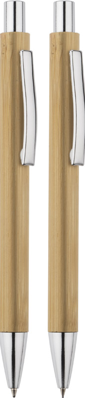 Zestaw piśmienniczy MAMBOO składa się z długopisu oraz ołówka automatycznego zapakowanych w brązowy, ekologiczny kartonik z tektury. Korpus długopisu i ołówka wykonany został z naturalnego bambusa. Chromowane wykończenia nadają mu elegancji. Wkład długopisu w kolorze niebieskim, ołówek automatyczny o grubości 0,7 mm.