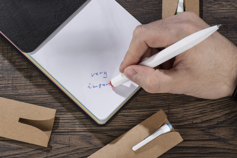 Długopis pozwalający na korektę wszystkich błędów to wymarzony gadżet dla uczniów. Specjalny wkład pozwala na zmazanie napisanego tekstu za pomocą gumki umieszczonej na górze długopisu. MAZZI wykonany jest z tworzywa w białym kolorze z kolorowymi akcentami. Zapakowany w estetyczne etui z papieru. Długopis automatyczny, wkład w kolorze niebieskim.
