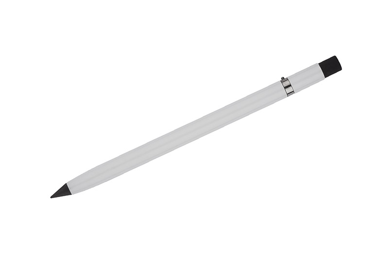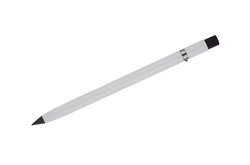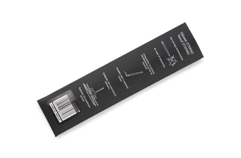 ETERNO to nowy typ ołówka, który zawsze będzie zatemperowany i nigdy się nie wypisze. Tradycyjny grafit został tu zastąpiony specjalnym utwardzonym rysikiem, który daje komfort pisania podobny do świeżo zatemperowanego ołówka. Korpus wykonany z aluminium zapewnia trwałość na lata. Na górze umieszczona gumka do mazania, która bez problemu zetrze notatki wykonane ołówkiem ETERNO (możliwość użycia także innych standardowych gumek). Ołówek wpisuje się w trend eko pozwalający zminimalizować ilość odpadów oraz surowców zużytych do produkcji przedmiotów codziennego użytku. Pakowany w czarne papierowe etui z infografiką z tyłu.