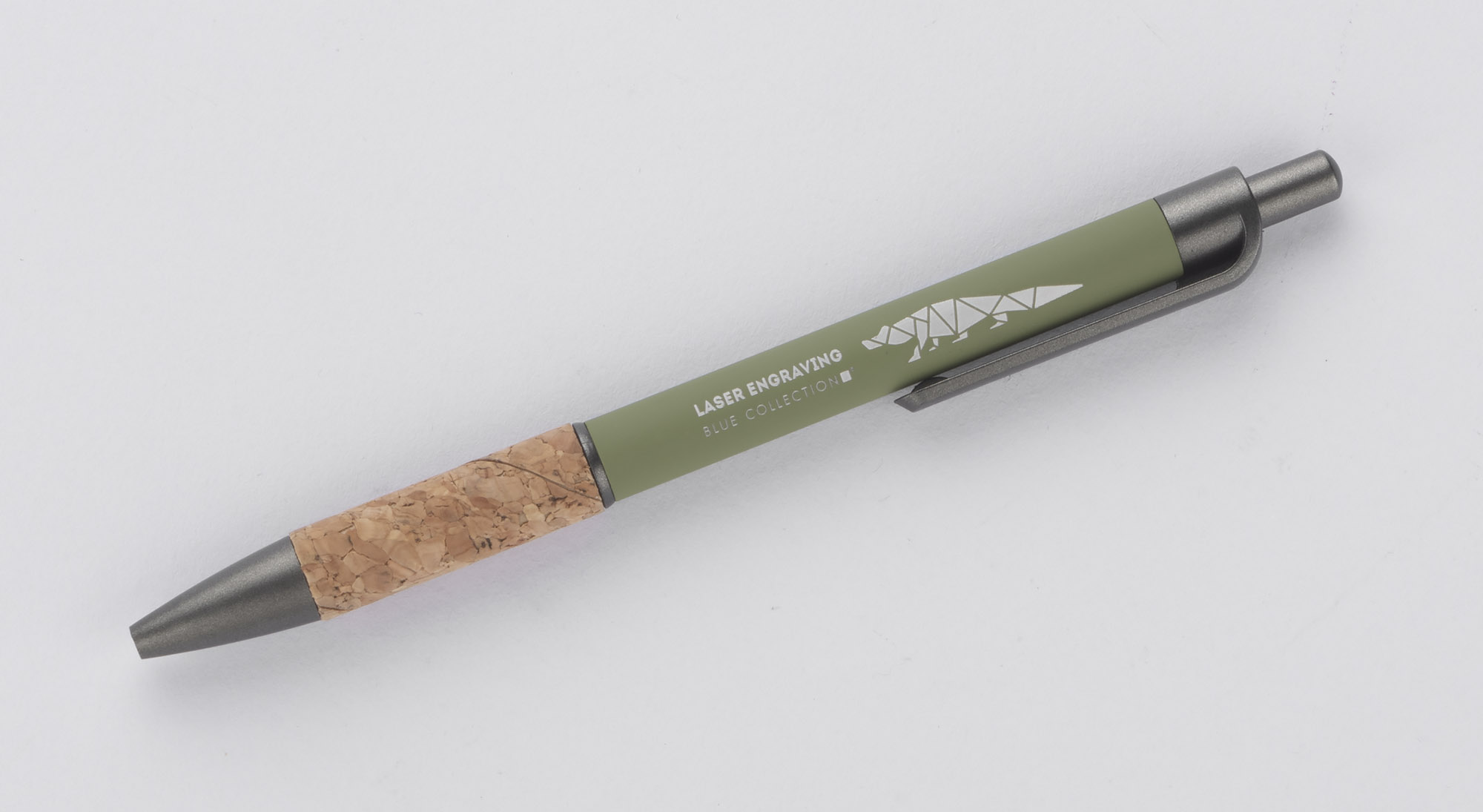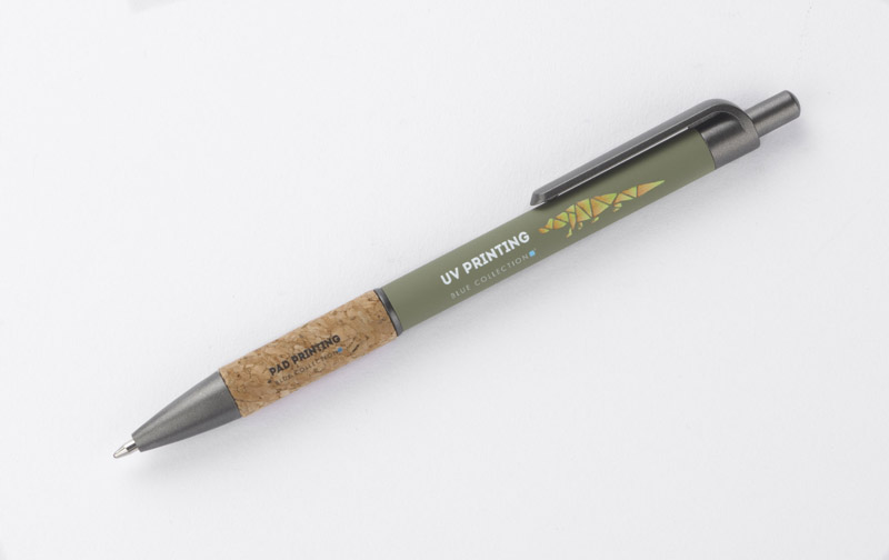 Długopis KUBOD to klasyczny model o prostym, eleganckim kształcie, idealny do znakowania. Aluminiowy korpus pokryty został matową powłoką soft touch, która zwiększa komfort użytkowania. Naturalny korek w części chwytnej przyciąga uwagę i wyróżnia produkt na tle standardowych modeli. Metaliczne akcenty z tworzywa dodają całości nowoczesnego charakteru. Długopis posiada mechanizm automatyczny i jest wyposażony w niebieski wkład typu X20 (wymienny, niedostępny w naszej ofercie).