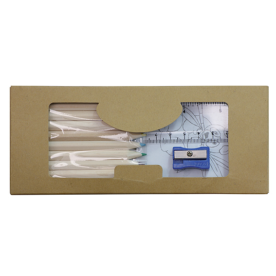Zestaw małego artysty zawierający kolorowankę, dziesięć drewnianych kredek, linijkę oraz temperówkę. Logo nadrukujemy na kartoniku.