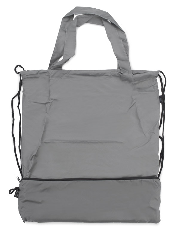 Worek na sznurkach z parasolem RAINY wykonany jest z poliestru RPET, co czyni go bardziej przyjaznym środowisku. Środek worka jest jednokomorowy. Oprócz tradycyjnych sznurków posiada jeszcze rączki o długości 44 cm, dzięki czemu może być używany także jako torba na zakupy. Na dole worka znajduje się zamykana na zamek kieszeń, w której schowany jest dołączony do zestawu parasol, także wykonany z poliestru RPET. Parasol jest otwierany i zamykany ręcznie. Maksymalny udźwig worka to około 3 kg. Wymiary produktu: worek: 370 x 410 mm, parasol: ⌀ 990 mm, dł. 550 mm (złożony: 240 x 60 x 50 mm)