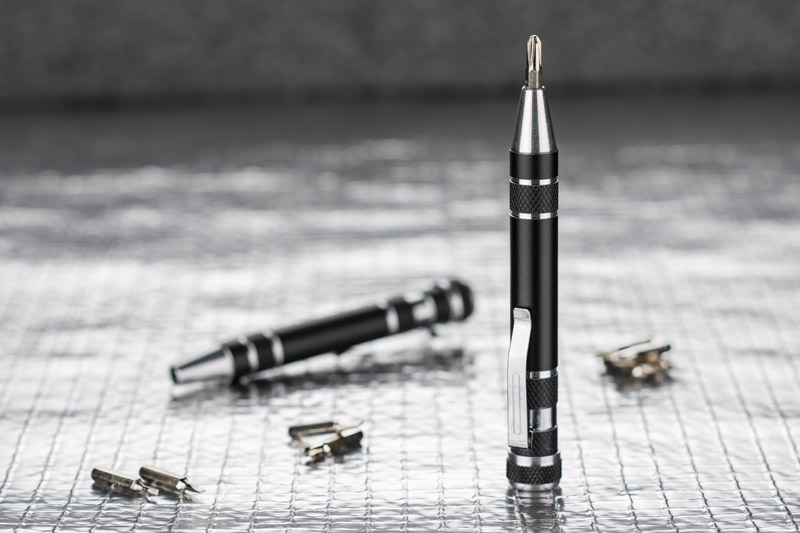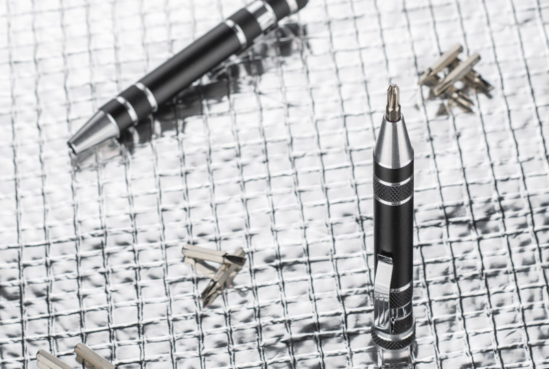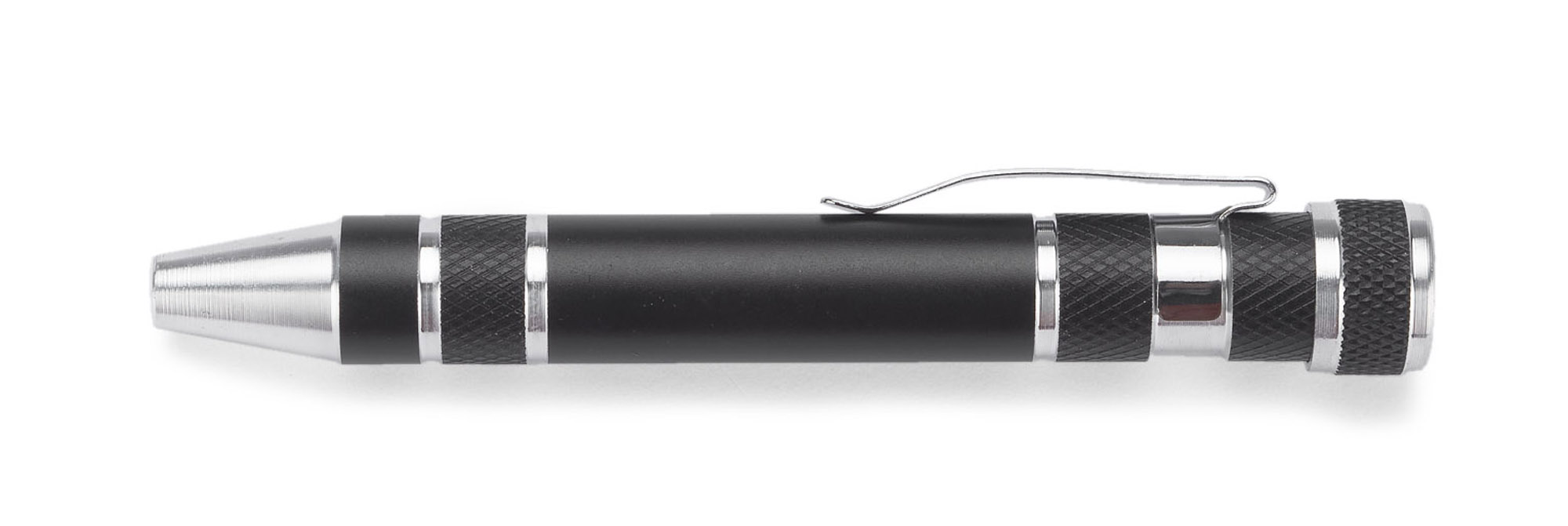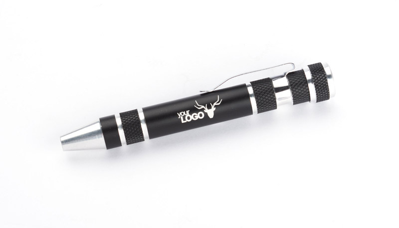Komplet śrubokrętów zawiera 8 różnych końcówek. Klip umożliwia przymocowanie do kieszeni dzięki czemu zapobiegnie przypadkowemu zgubieniu. Końcówki śrubkrętów mocowane za pomocą magnesu. Logo wygrawerujemy na powierzchni.