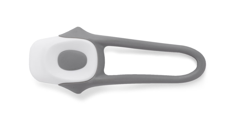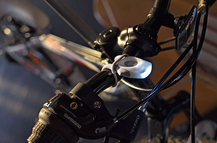 Praktyczna lampka rowerowa z dwoma diodami LED oraz silikonowym mocowaniem do roweru. Lampka przednia - posiada białe diody.