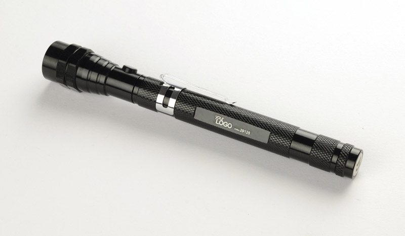 Niesamowity gadżet o licznych zastosowaniach. Wykonana w całości z metalu latarka posiada rozsuwany, teleskopowy korpus oraz ruchomą główkę z 3 diodami LED. Dodatkowym atutem są magnesy umieszczone na obydwu końcach latarki. Konstrukcja jest bardzo solidna i wyposażona w metalowy klip do zawieszenia. Znakowanie możliwie na specjalnie przygotowanej płaskiej powierzchni na rękojeści.