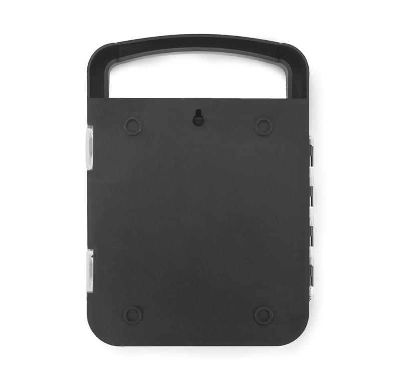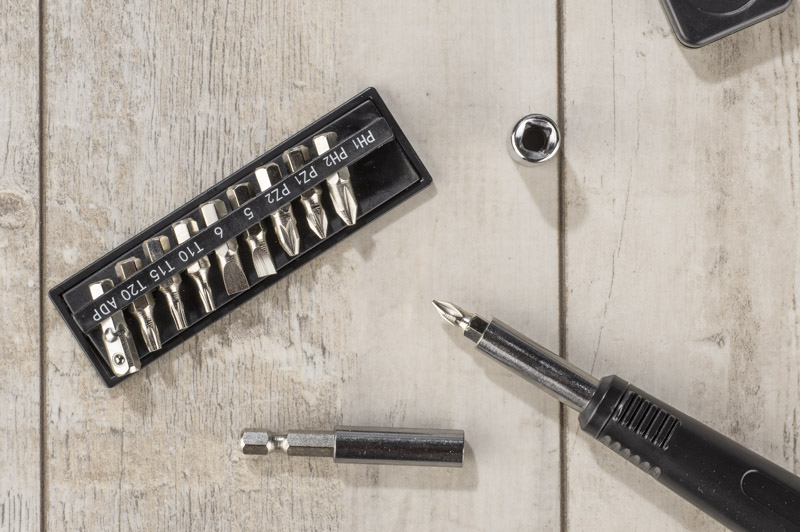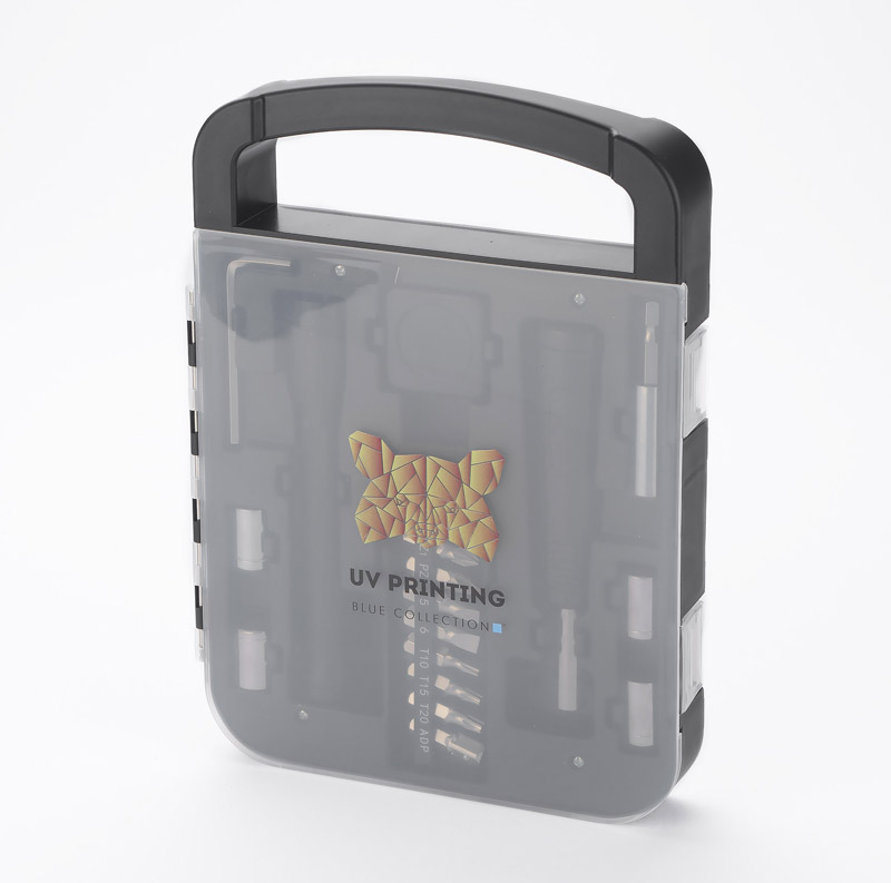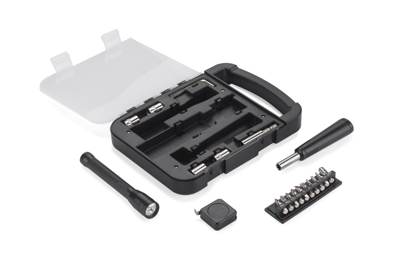 FIXO to zestaw narzędzi w praktycznej obudowie. Wewnątrz znajdują się: klucz imbusowy, latarka, miara, wkrętak, dziesięć różnych bitów, przedłużka i cztery końcówki nasadowe 7mm, 8mm, 9mm i 10mm.